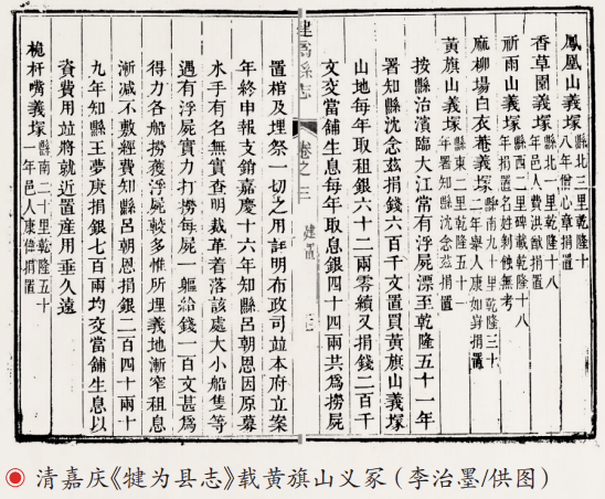 任职犍为期间,“节孝、节烈、贞女、烈女”等事迹,吕朝恩作为知县,详请旌表不少。但最值得一书的,还是两件事。一是书院公田,“嘉庆十七年知县吕朝恩捐银四百两,赎回兴隆寺当出田地三十八亩。征条银一两一钱七分,坐落李家沟,每年收市斗租谷四十三石,合仓斗谷一百三十石零二斗。地二段,共收租银三两一钱”,这就从经费上保证了书院的长期运行;二是黄旗山义冢,“县治滨临大江,常有浮尸漂至……嘉庆十六年,知县吕朝恩因原募水手,有名无实,查明裁革。着落该处大小船只等,遇有浮尸,实力打捞,每尸一驱,给钱一百文,甚为得力。各船捞获浮尸较多,惟所埋义地渐窄,租息渐减,不敷经费,知县吕朝恩捐银二百四十两……交当铺生息,以资费用;并将就近置产,用垂永远。”清嘉庆《犍为县志》(卷之四·食货)记载:“本县知县俸薪银四十五两,养廉银六百两。”吕朝恩这两件善举,确实是尽心尽力。