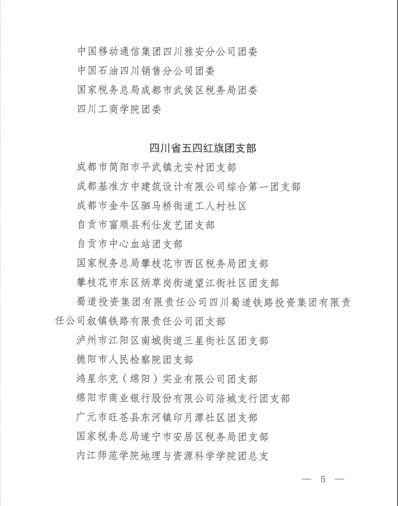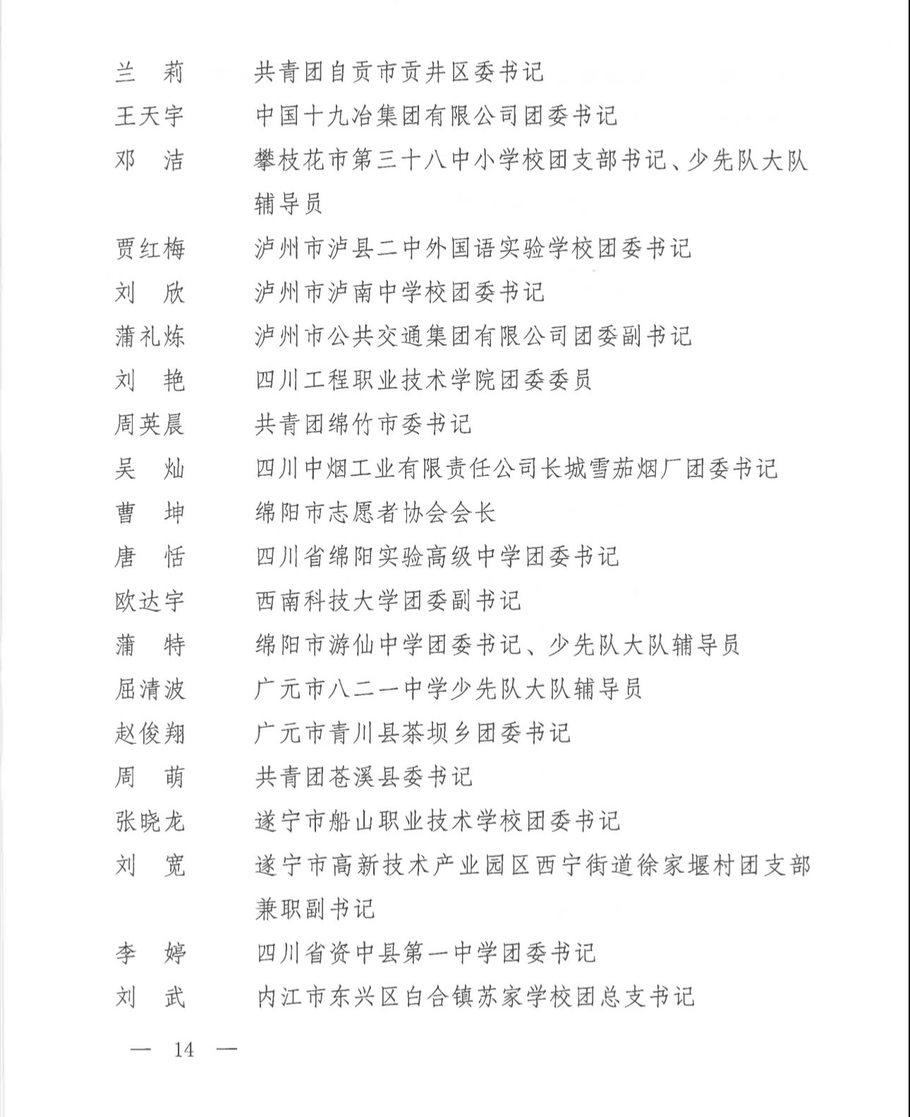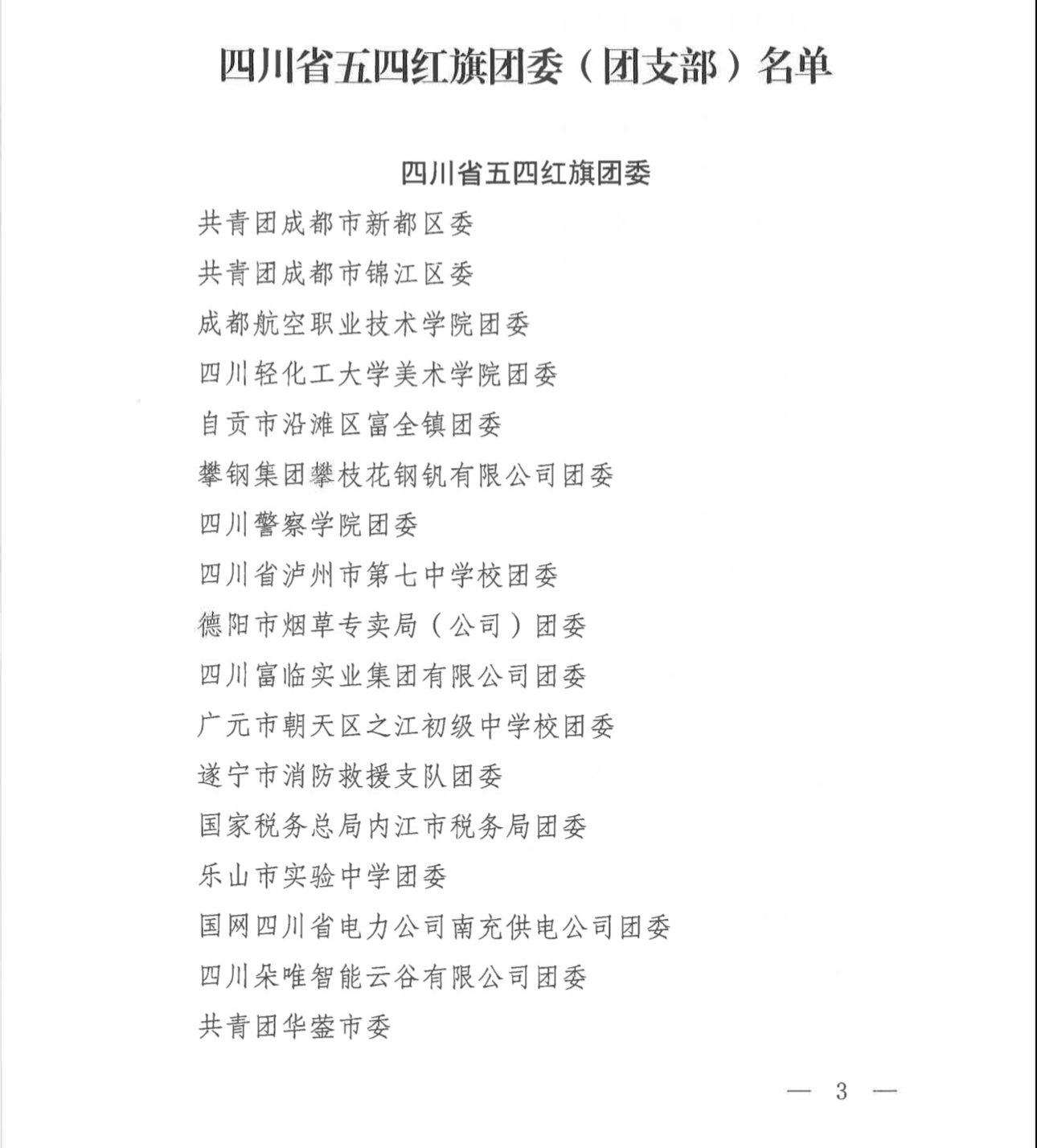 为表彰先进、树立典型,激励各级团组织和广大团员、团干部奋发有为、再创佳绩,共⻘团四川省委决定授予共⻘团成都市新都区委、成都市简阳市平武镇尤安村团支部等90个团组织四川省五四红旗团委(团支部)称号,授予方轶萱、乔沛姝等180名同志四川省优秀共⻘团员、共⻘团干部称号。