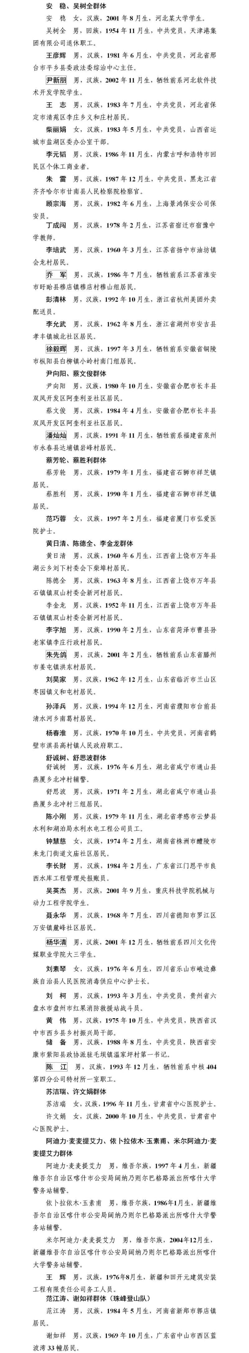 上榜勇士中,有从高桥上跳水救人导致胸椎骨折的外卖小哥彭清林和另一位高桥跳水救人的中学教师丁成闯;有冒着9级大风在海上营救遇险台胞的渔民蔡芳轮、蔡胜利;有放弃登顶珠峰机会而救助同胞的珠峰登山队队员范江涛、谢如祥;有万米高空机舱里抢救濒危病人的护士长刘素琴;有勇斗盗贼被刺几刀仍不退缩的江苏村民李培武;有身患癌症却横渡渌江河救人的乐观大姐钟惠慈;有跳进充满沼气深井救人致多器官感染的山东小伙李字旭;更有勇救落水群众献出宝贵生命的潘灿灿、朱先鸽、尹新朋、乔军、徐毅晖、杨华清、陈江七位勇士,让我们致以最崇高的敬意!