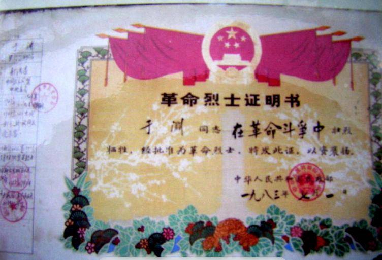 于渊革命烈士证书