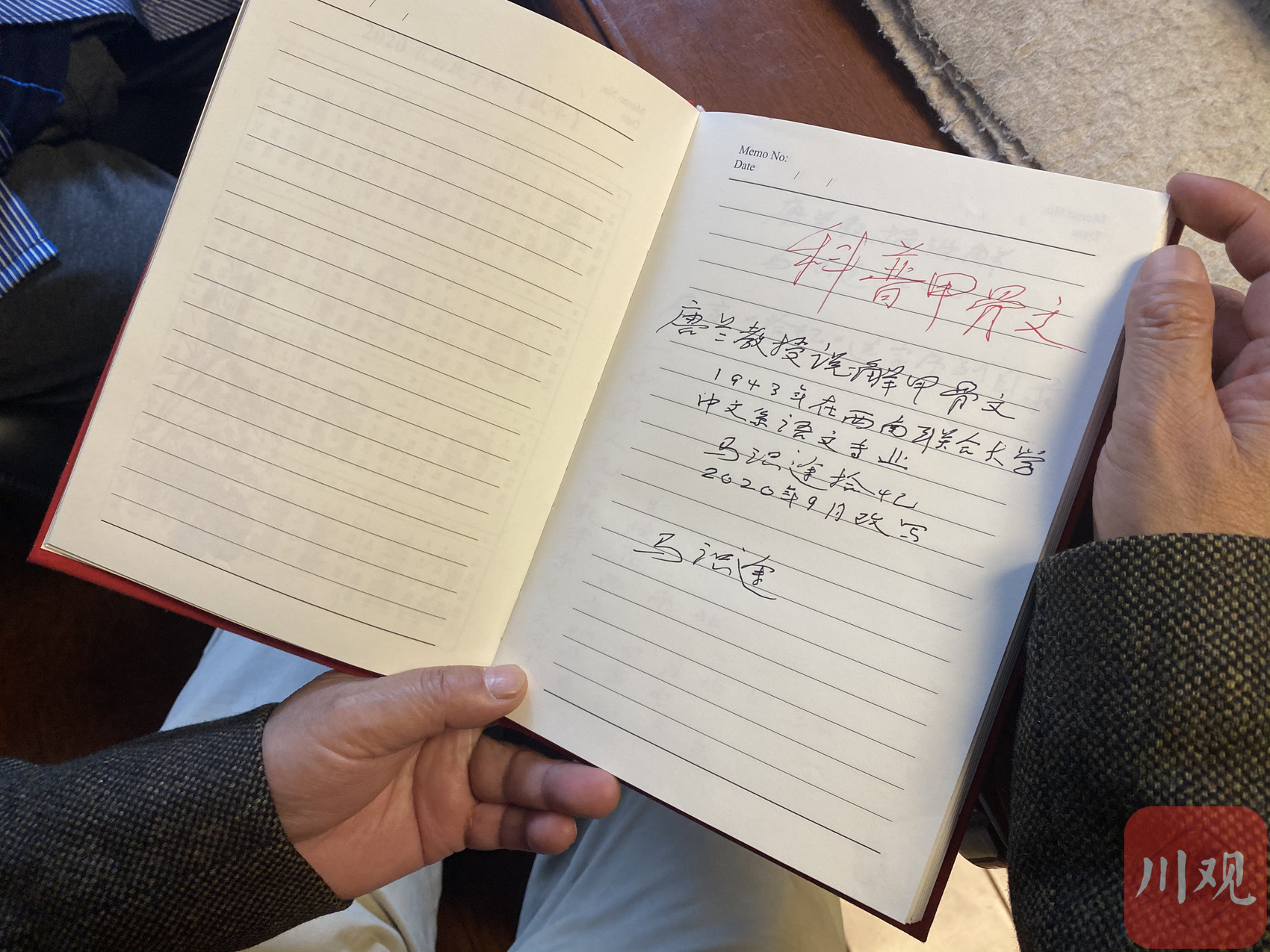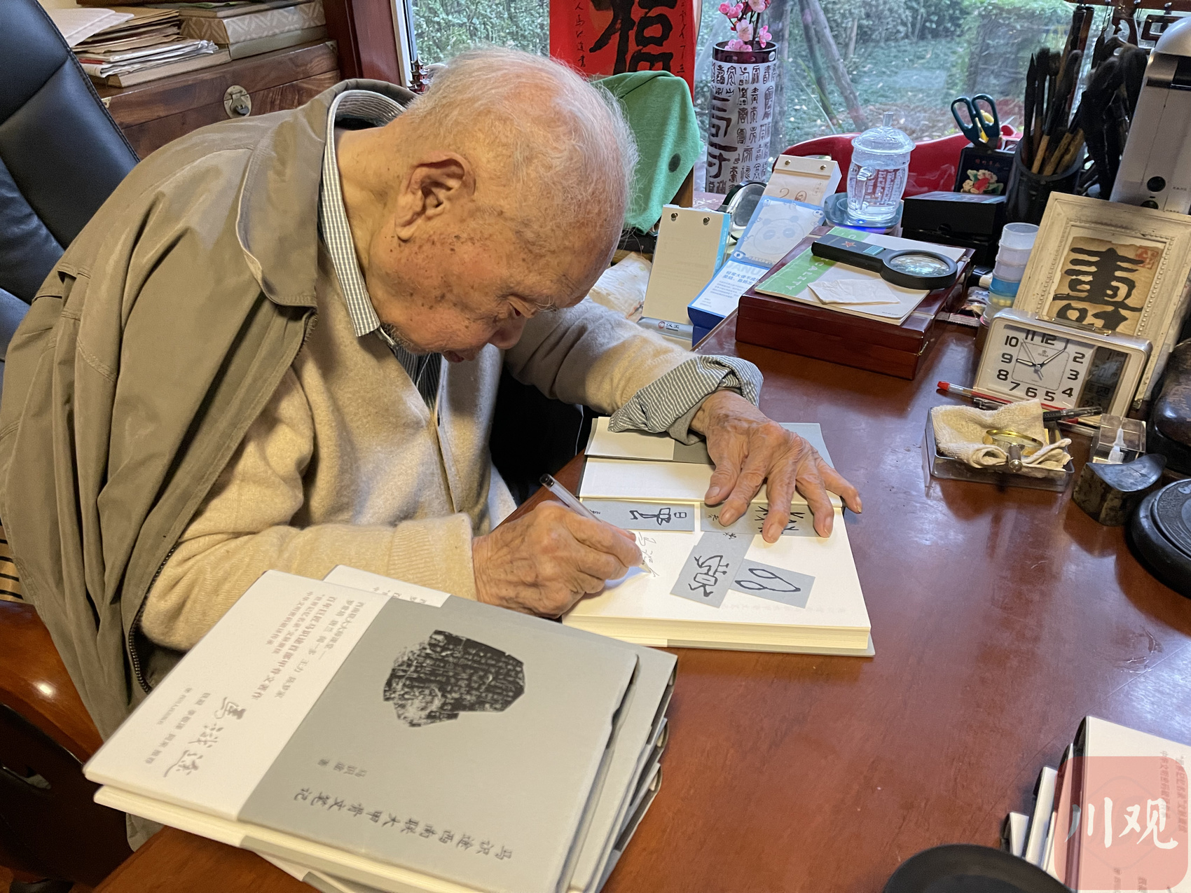 封笔不停笔。这是阿来在回去的路上,帮马老总结出来的现状。还真给他说对了!时隔半年,2021年3月,我和阿来又去马老家,这回更是让我们俩惊掉了下巴——书法不断在写,更重要的是,马老对甲骨文的研究从未停歇,他封笔后的新书,甲骨文研究著作《马识途西南联大甲骨文笔记》即将由四川人民出版社出版,他还挥毫泼墨,亲自题写了书名。