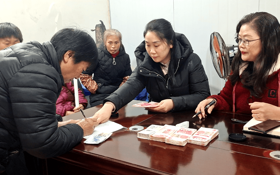 钟丽(右二)在泸县得胜镇顺民村为部分社员发放工资