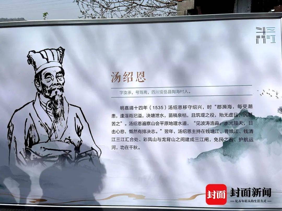 2024年是中国大运河成功申遗10周年。2024年4月,中国报纸副刊研究会年会暨“循迹溯源·运河文化绍兴行”百名文化记者采访调研活动走进了浙江绍兴。在钱塘、钱清、曹娥三江汇合处,有一座桥闸结合的明代建筑——三江闸。距堤坝不远处有一个宣传栏,介绍了明代绍兴知府汤绍恩的功绩。值得一提的是,汤绍恩是四川省安岳县陶海村人,他和苏轼一样,都是从蜀地走向全国的治水专家。他在绍兴主持建设三江闸,修建了绍兴古纤道,提高了浙东运河(绍兴段)的航运能力,有着“绍兴恩公”的美誉。