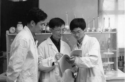 1983年,王方定(中)指导硕士生孙建国研究工作
