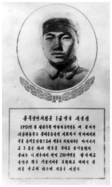 朝鲜军事博物馆里,曾陈列过一张绘制的志愿军战士模拟“遗像”,并记录了这名战士在抗美援朝第五次战役朴达峰阻击战中孤身作战,杀敌百余人,连续夺回3个阵地的英雄事迹。