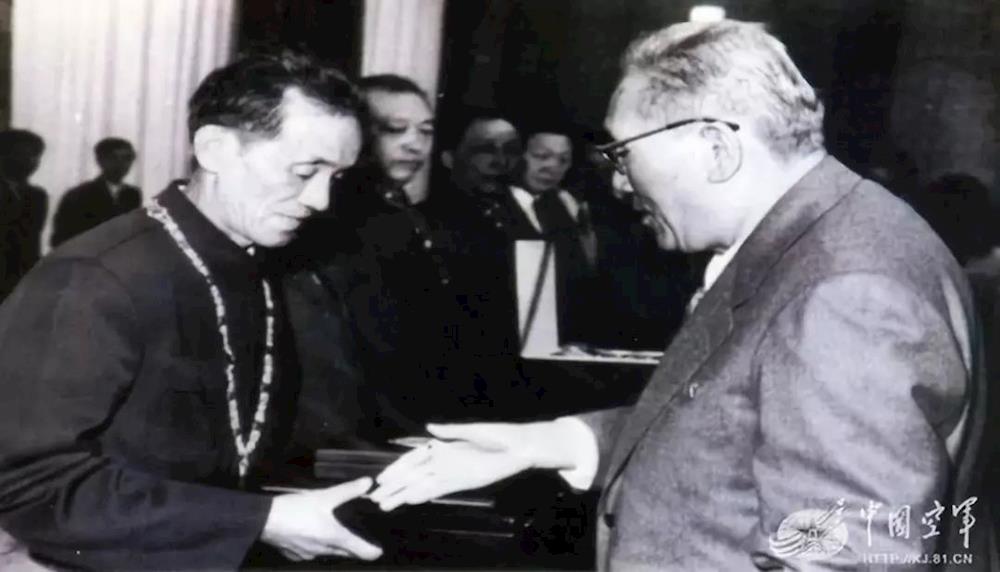 1985年10月,金日成特别举行了盛大的授勋仪式,授予杨成武、刘振华(某空军副司令员,抗美援朝一级战斗英雄)、柴云振3人“一级自由独立勋章”,并亲自将勋章戴在他们胸前(图片来源:中国空军网)