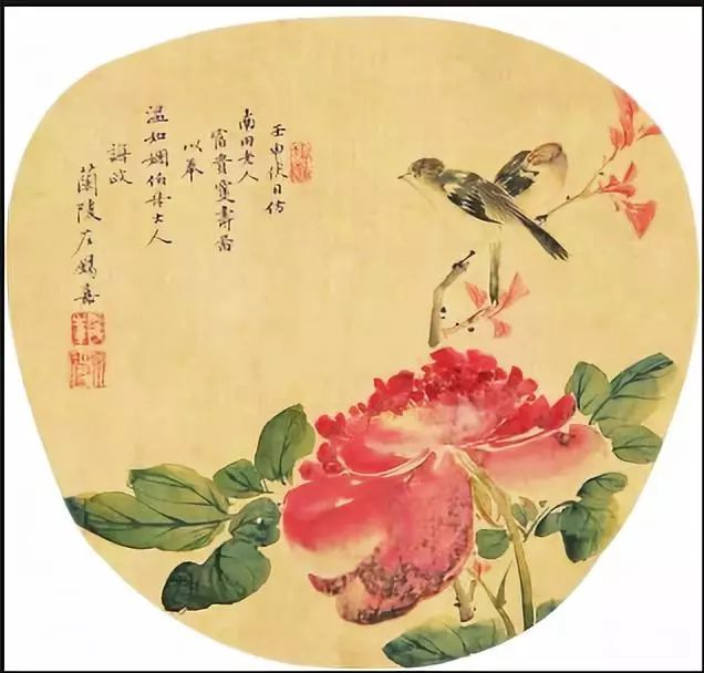 花鸟镜心设色绢本。画家:左锡嘉(曾咏之妻)
