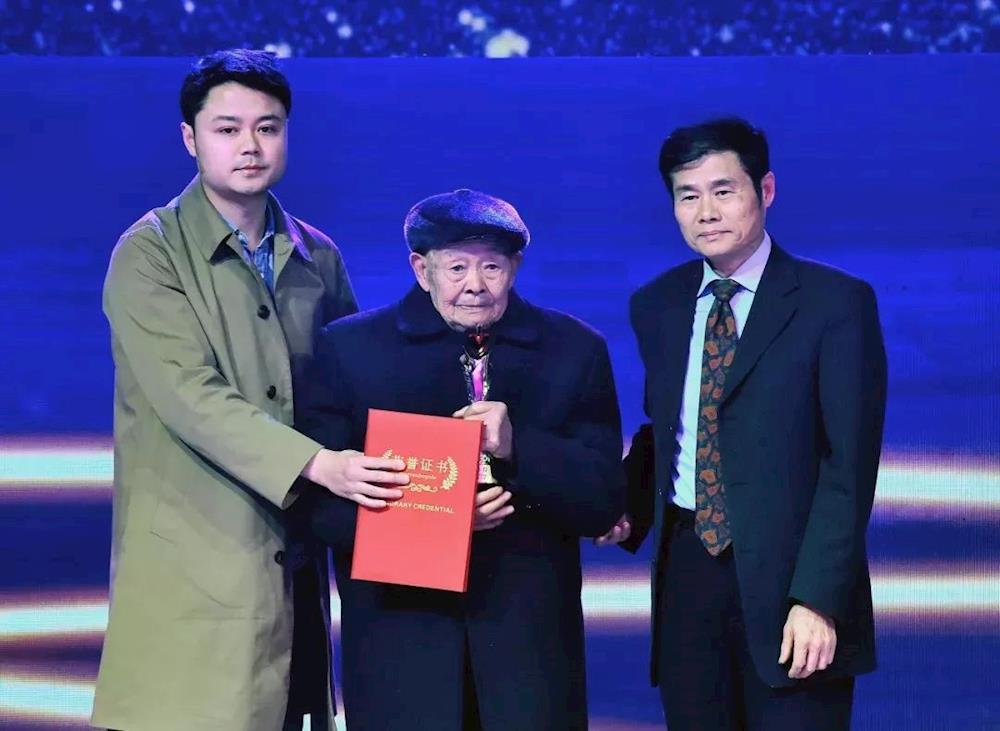 2019年1月18日,“勇救落水幼童的88岁老兵”何有义(中)上台领奖(新华社记者 李贺 摄)
