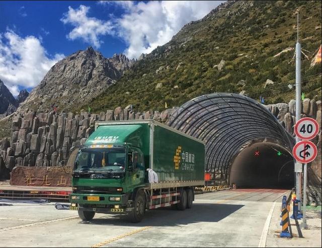 雀儿山隧道通车当天,其美多吉的邮车作为社会车辆的头车第一个穿过隧道(毛志鹏 摄)