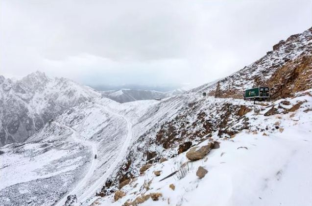 其美多吉与同事驾车行驶在雪线邮路上(图片来源:新华网)