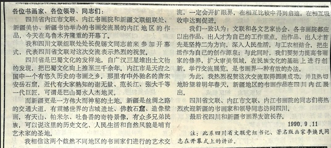 1990年,李焕民在新疆书画交流展的讲话(载《内江文艺界报》)