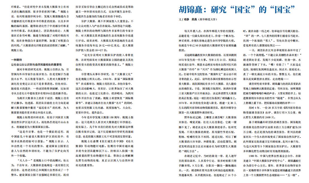 每天早晨8点,在西华师范大学的校园里, 总能看见一位满头银丝的老人,拎着一个帆布包, 神采奕奕、步履从容地走进生命科学学院的大楼。 他就是今年已90岁高龄的大熊猫研究专家胡锦矗教授。