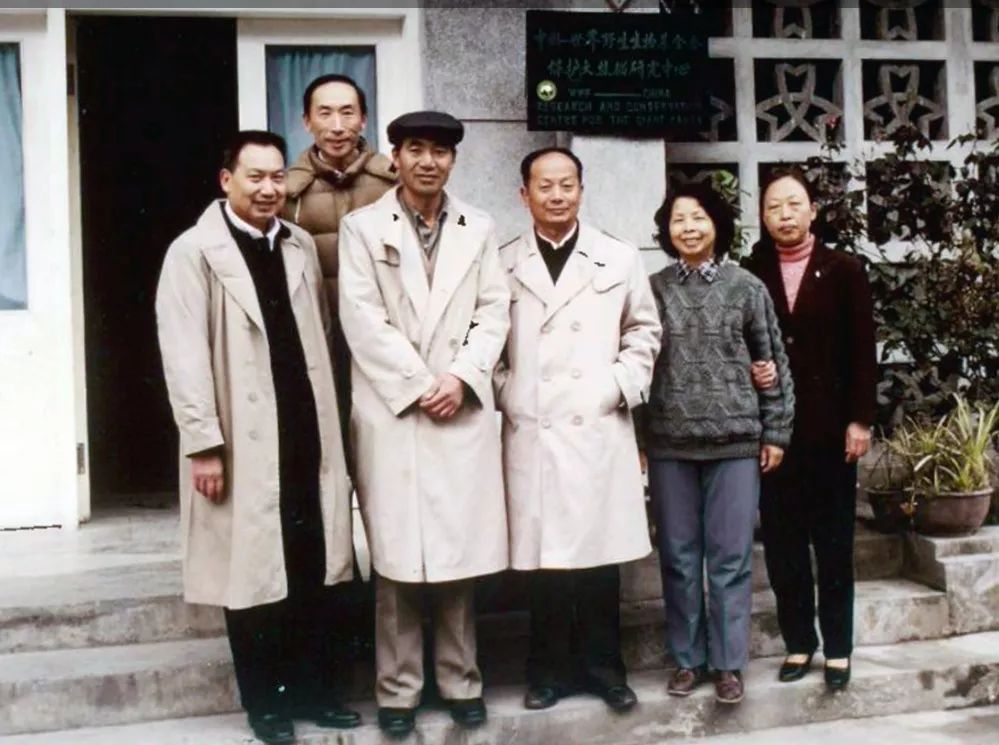 胡锦矗(左一)、秦自生(右一)在“保护大熊猫研究中心”(图片来源:西华师范大学网)