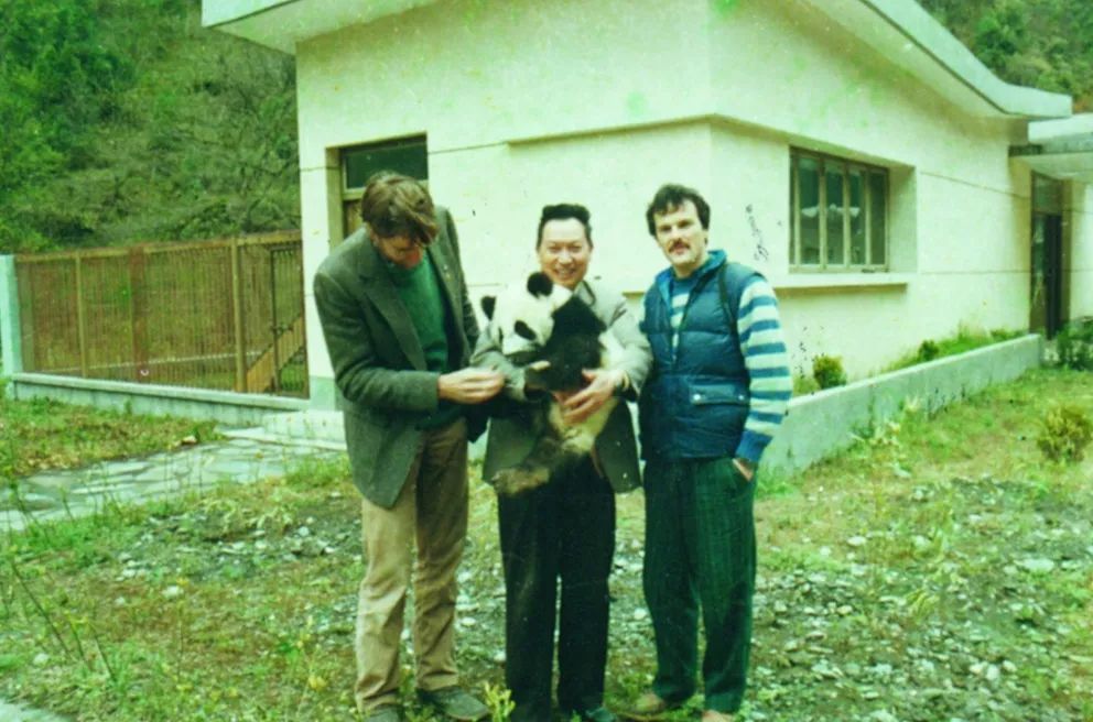 1984年竹子开花后,胡锦矗教授与乔治·夏勒(美)在灾后发现一具熊猫尸体,进行观察记录(图片来源:西华师范大学网)