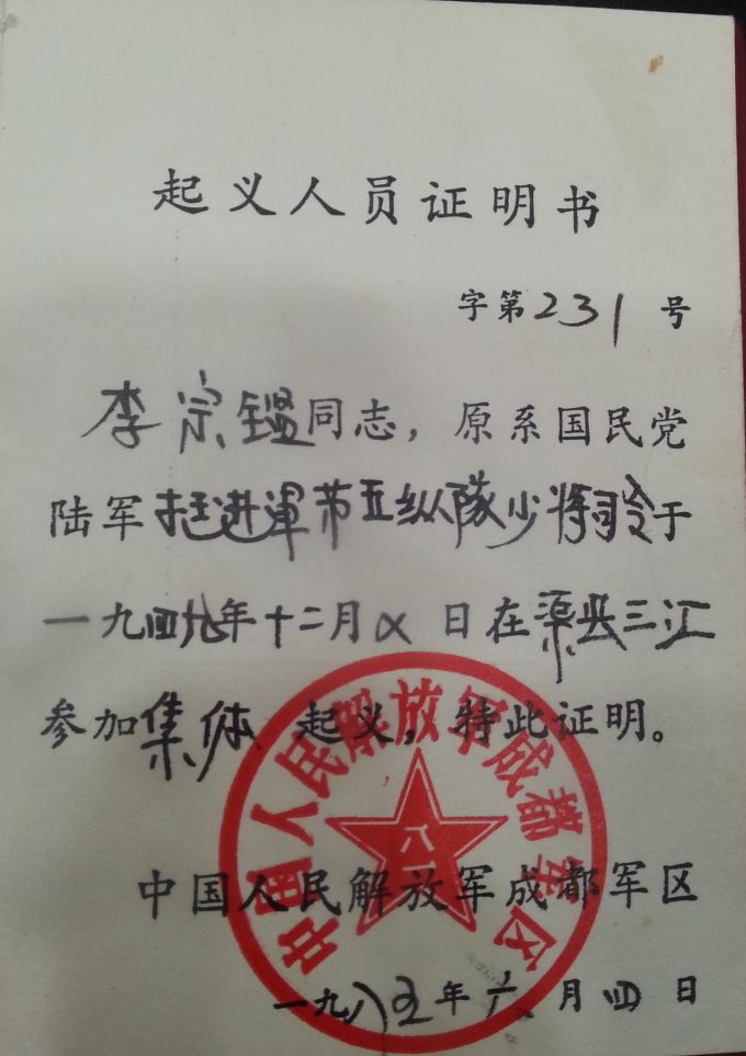 1984年1月23日,大竹县人民法院撤销1951年10月18日对李宗铿(鉴)的判决书,按起义人员对待。从此,被冤屈而死的抗日将领李宗铿(鉴)得到正义伸张。1985年6月4日,中国人民解放军成都军区给李宗铿(鉴)颁发了《起义人员证书》。
