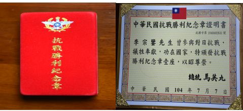 2015年1月5月,中国国民党中央主席马英久为李宗铿(鉴)頒发中华民国抗战胜利纪念章。