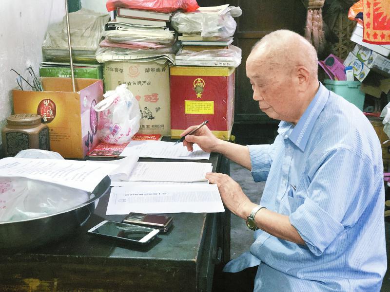 7月3日,周永开在书桌前准备党课内容。平日里,他在这书桌前看书、读报,常常一坐就是一整天。 本报记者徐莉莎摄