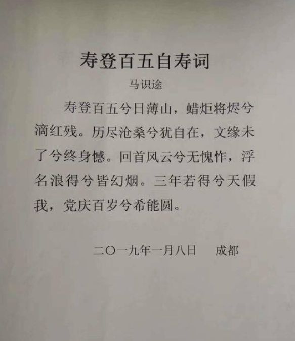 100岁时,马识途定下了一个“五年计划”,那就是再活五年。2019年1月,迈入105岁时,他又许了个愿望——向天再借三年,亲眼见证中国共产党成立100周年。在《寿登百五自寿词》中,他写道:“三年若得兮天假我,党庆百岁兮希能圆。”作为一位有80余年党龄的老党员,这是他现在唯一的愿望。
