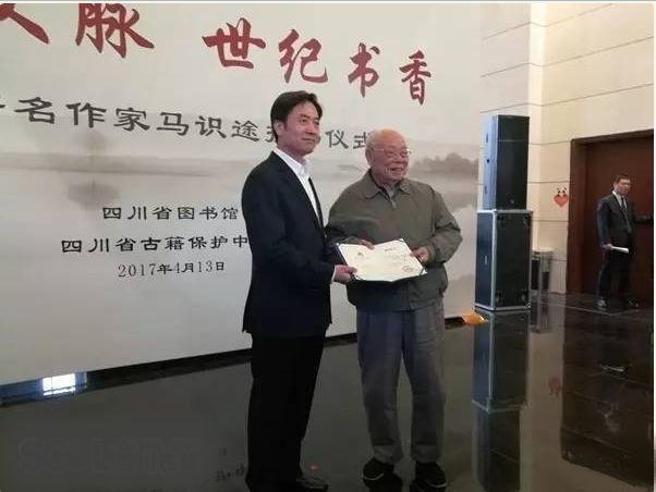 2017年4月13日上午,马识途将自己精心保存的22种共66册线装书捐献给四川省图书馆。四川省委常委、宣传部部长甘霖出席捐赠仪式并向马识途颁发收藏证书(图片来自网络)