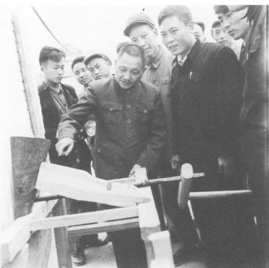 1958年10月,邓小平到河北定县视察,询问当地农机具改革情况(图片来源:广安日报)