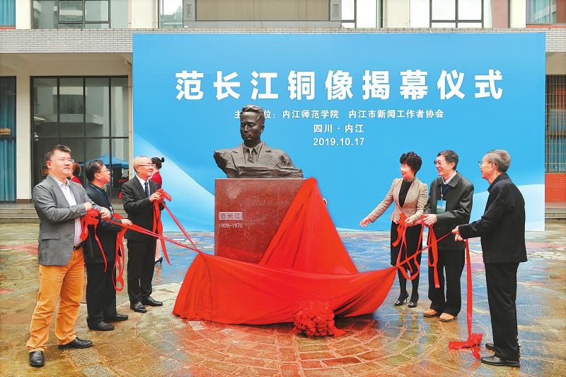 据悉,铜像由部分范长江新闻奖获奖者捐资,由著名军旅雕塑家郎钺创作完成。当天,内江还举行了“弘扬长江精神着力增强‘四力’”主题报告会和“弘扬范长江精神做党和人民信赖的新闻工作者”主题交流会。 揭幕仪式现场。