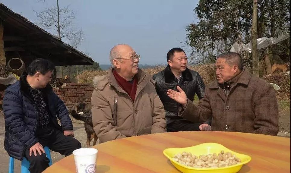 罗锦麟教授(左二)在威远县连界镇庙坝村与乡亲交流(陈辉忠 摄)