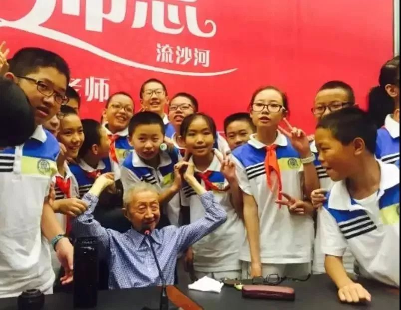 2016年9月9日,流沙河在成都市图书馆结束讲座后与听取讲座的学生合影(胡敏 摄,图片来源:教育导报)