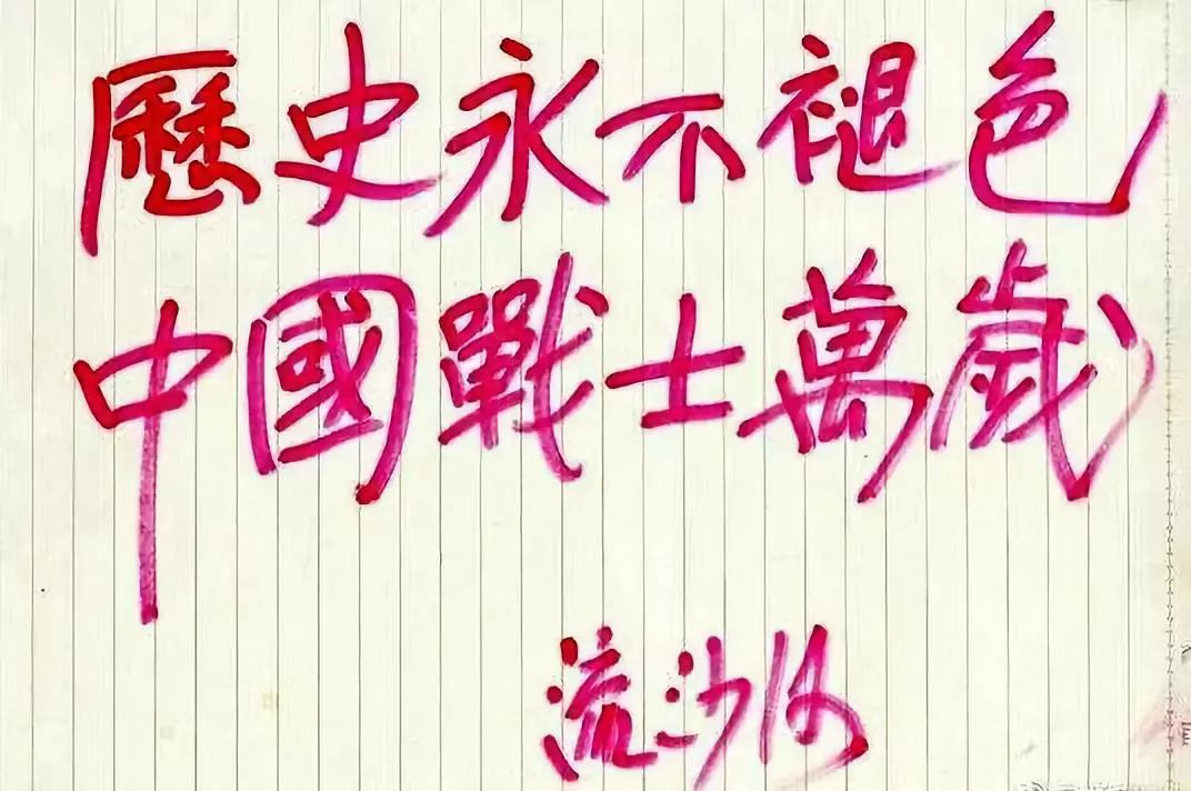 后来,他还写过“回顾历史,为了展望未来”“历史永不褪色,中国战士万岁”。
