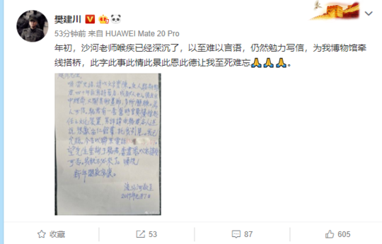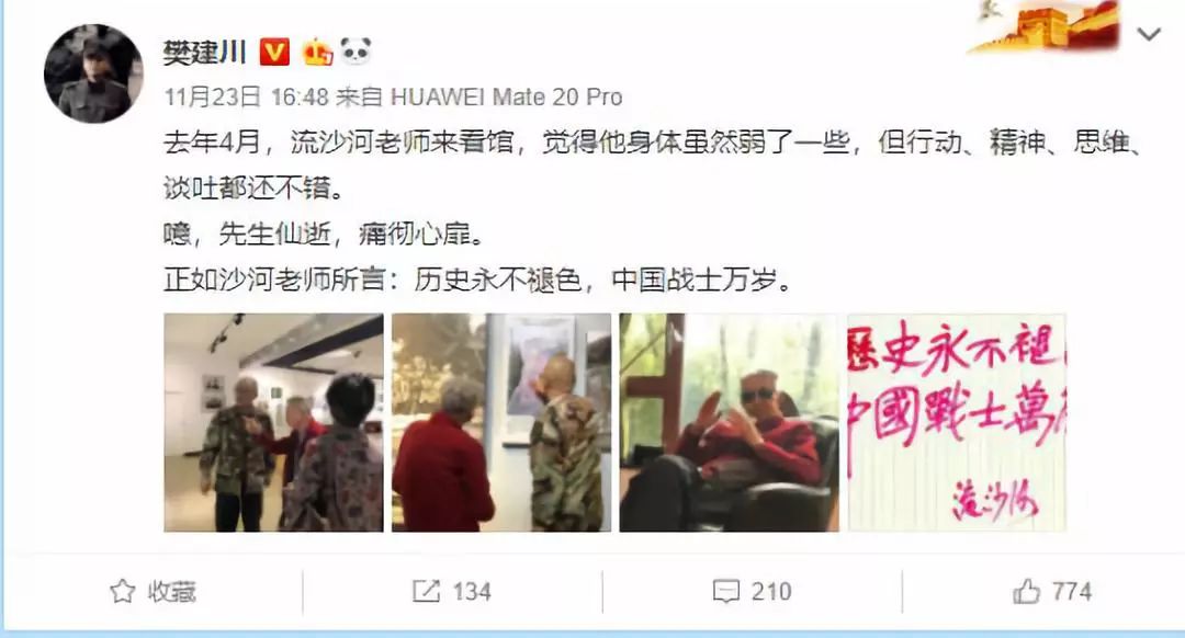 11月23日,流沙河先生去世的消息传来,四川不少文博界人士表达了哀悼,建川博物馆馆长樊建川就是其中之一,他在自己的微博上数次追思这位忘年交:先生仙逝,痛彻心扉!