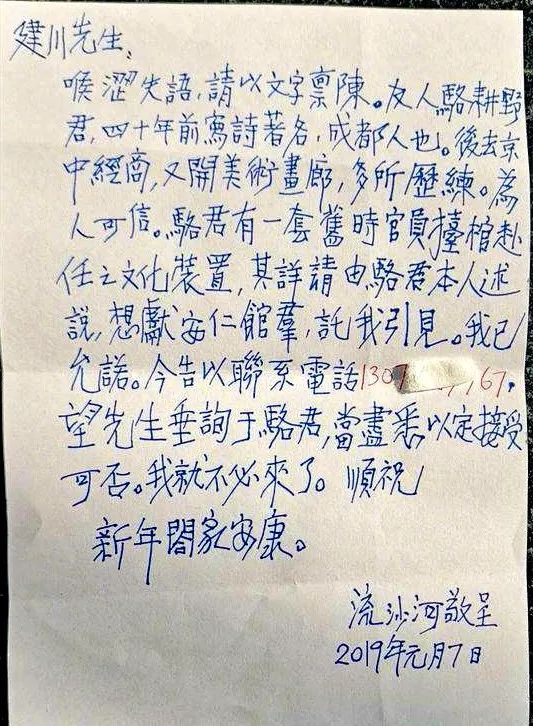 樊建川回忆,二十多年了,流沙河先生一直是他的良师益友,他一直得到先生的帮助和指点。2006年3月,流沙河先生初次来馆,尽管极瘦,却双眼睿智深邃,神态恬淡超然,精神矍铄,谈吐诙谐。2018年4月,先生再来看馆,身体虽然弱了一些,但行动、精神、思维、谈吐都还不错。2019年1月,他收到先生写的信,开篇就是“喉涩失语,谨以文章禀陈”,不成想,这喉疾竟然要命。