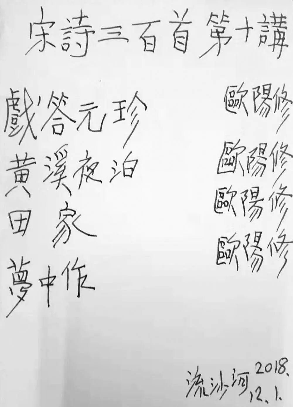 流沙河先生远远地看见我们,照例很谦逊地微笑弯腰致意。这是春节以后我第一次看见先生,寒暄时发现他的嗓音有些沙哑,便关切地问起缘由。先生淡淡地笑说:没啥,前段时间成都的空气质量不好,沙声沙气都快8个月了。这次接先生去图书馆,是讲《唐诗三百首》。此前他已经讲过《诗经》《古诗十九首》《汉魏六朝诗》。按照我跟他的约定,由他主讲的《中国诗歌通讲》还将讲到宋元明清诗歌和近现代诗歌,包括台湾余光中等人的诗。这是一个庞大的系统工程,按照一月一讲的频率,将耗去先生十余年宝贵时光。我本来打算请先生一月两讲,但先生的夫人吴茂华女士爱惜先生身体,不允。