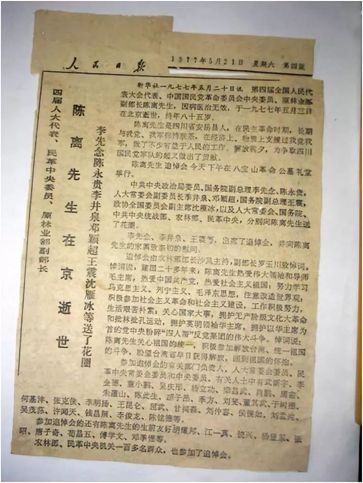 人民日报报道了陈离逝世的消息 (图片来自网络)