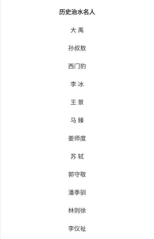 据了解,首批历史治水名人推选工作是根据《新时代水利精神宣传贯彻工作方案》安排,由水利部精神文明建设指导委员会办公室组织开展,经过资料整理、研究分析、征求意见、网络投票、专家审核等程序,并报部党组审定,于2019年12月6日公布。第一批“历史治水名人”共12位,分别是大禹、孙叔敖、西门豹、李冰、王景、马臻、姜师度、苏轼、郭守敬、潘季驯、林则徐、李仪祉。