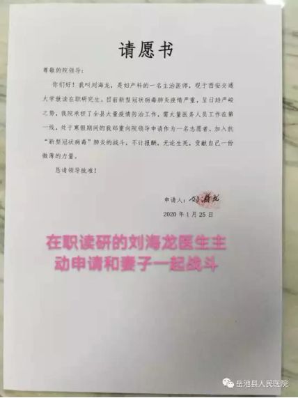 吕林励是岳池县人民医院感染科护士长,丈夫刘海龙是岳池县人民医院在职读研的妇产科医生。疫情爆发,吕林励始终战斗在防治一线。由于担心妻子,放假在家的丈夫刘海龙有时间就到感染科帮忙,并毅然递交了请战书,请求加入这场战斗。
