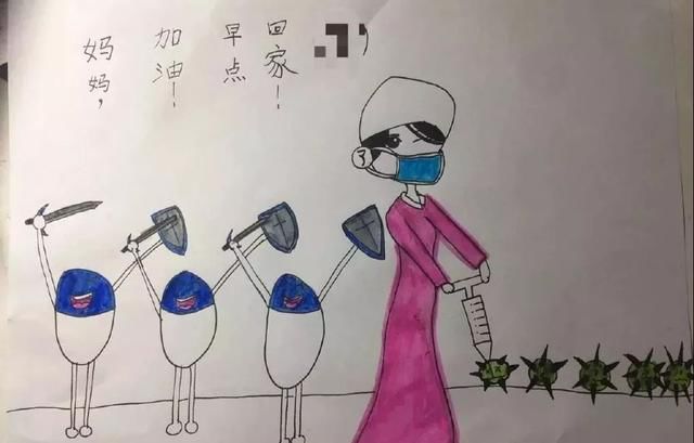 华西医院呼吸与危重症医学科护士谢莉的女儿画的一幅画,送给了出征武汉的妈妈,虽然8岁的女儿很多都还不懂,但她知道妈妈这次去武汉是去和病毒“打仗”了,于是画下了这幅画,希望妈妈能在这场战斗中加油!早点回家。