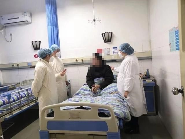 1月29日,华西绵竹医院感染科病房,一位女医生一边用手撑着腰,一边俯下耐心倾听发热患者倾诉,鼓励患者树立信心,鼓励他们勇敢战胜病魔。