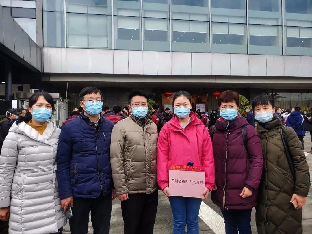 2月2日下午,四川省第三批援助湖北医疗队126名医护人员出征武汉。图为24岁汶川籍护士佘沙(右三)乘机前在成都双流国际机场与送别的四川省第四人民医院领导及有关负责人留影(图片来源:四川省第四人民医院)