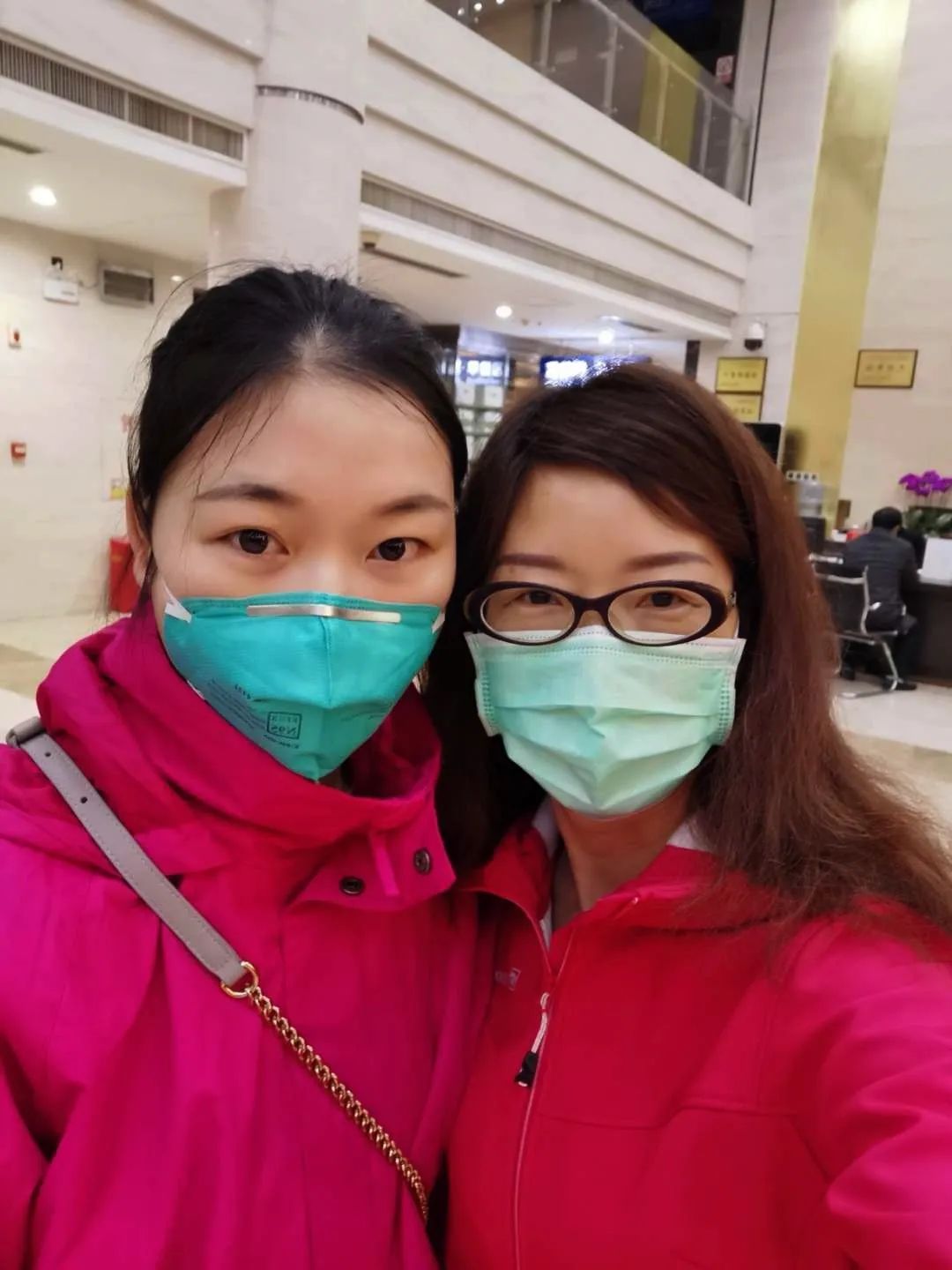 2月4日,四川省第三批援鄂医疗队队员佘沙(左)抵达武汉后,与四川省第一批援鄂医疗队队员、四川省第四人民医院重症医学科护士长周洁汇合(周洁 供图)