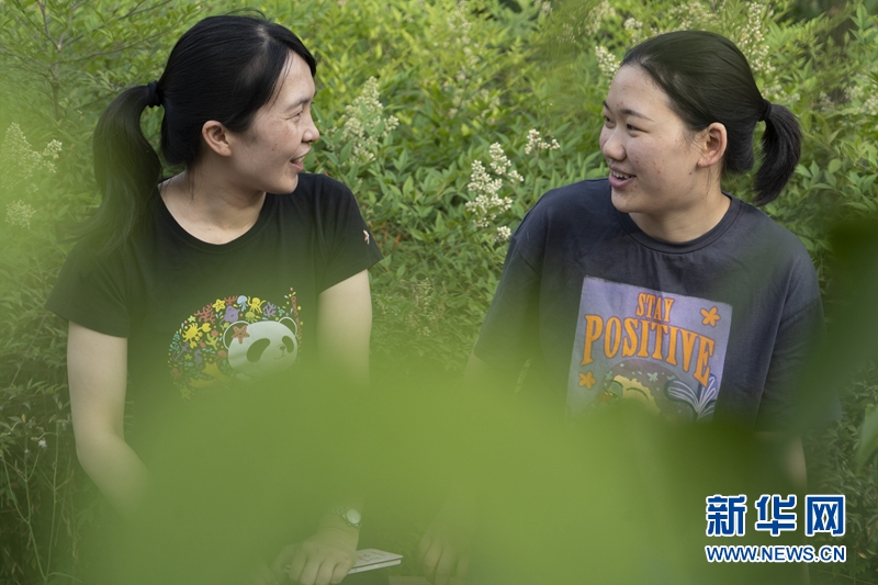 5月8日,在四川省成都市塔子山公园,佘沙(右)与同事聊天。