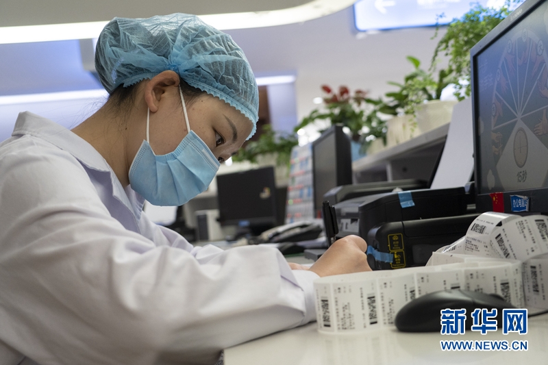5月8日,在四川省第四人民医院,佘沙在准备患者的药品标签。