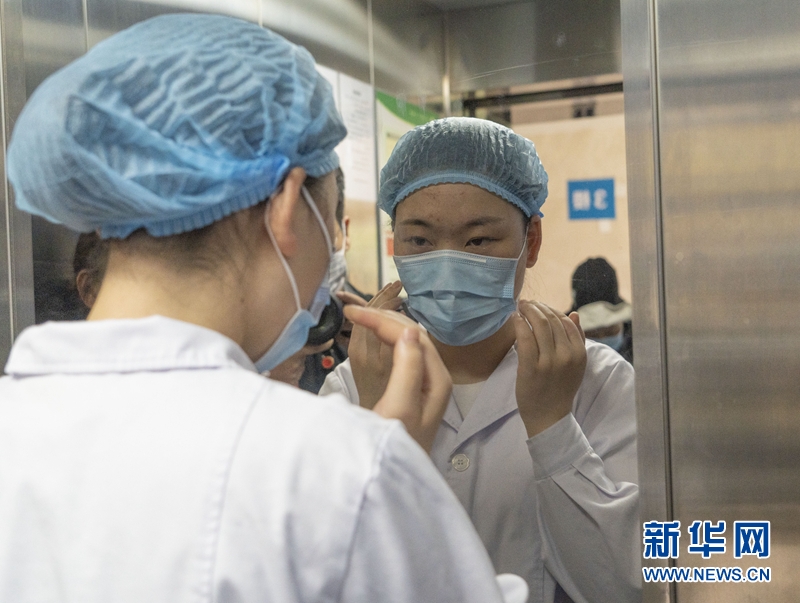 5月8日,在四川省第四人民医院,佘沙在电梯上对着镜子调整口罩。