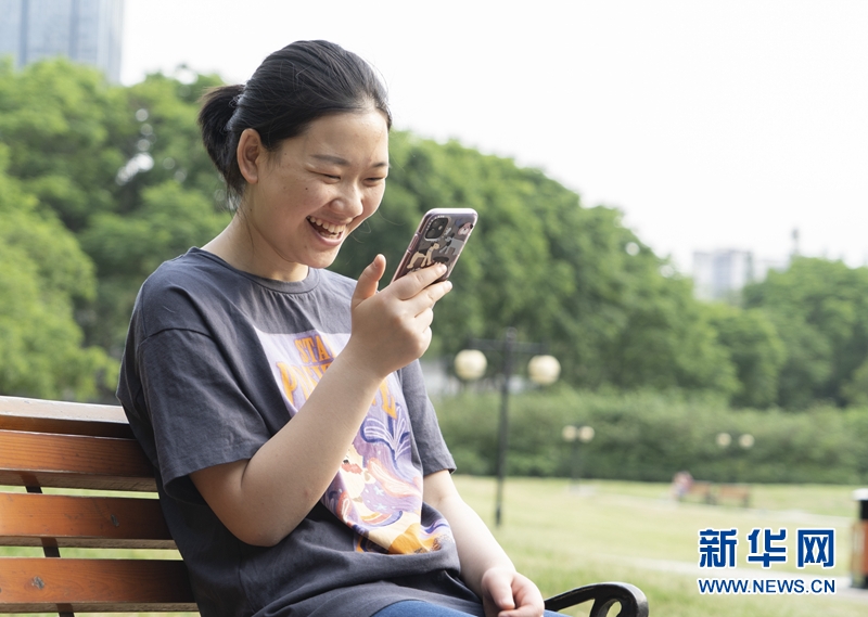 5月8日,在四川省成都市塔子山公园,佘沙与哥哥视频聊天。
