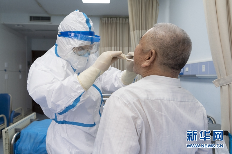 5月8日,在四川省第四人民医院,佘沙为新入院的病人采集咽拭子标本。
