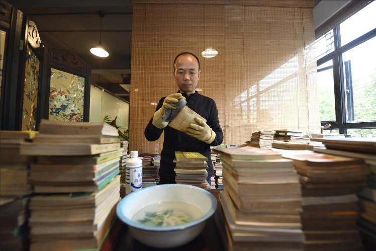 “毛边书,就是印刷的书装订后不切光,三面任其本然,不施刀削。页与页相连,看书时,需要用裁纸刀裁开来看。另外,在书的“天”“地”及四周,要多留空白。这是一种别具情趣的装帧方法,起源于欧洲,盛行于法国,之后流传到我国。”毛边书局创办人傅天斌正在为参观书局的读者介绍毛边书的来源。