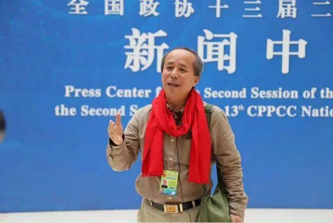 陈龙狮背挎军挎,在全国两会新闻中心接受央视记者采访