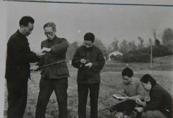 1984年,侯光炯与农技人员一起在相岭新桥田间测试土壤 摄影:高石汉(图片来自网络)
