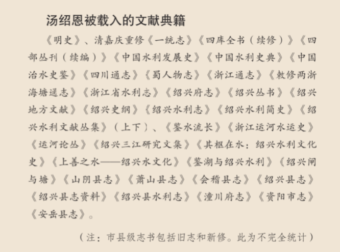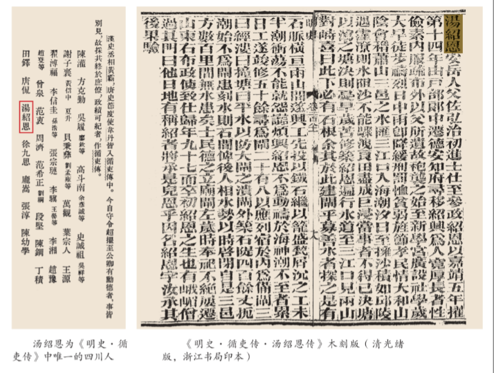 在二十四史中,《明史》为纪传体断代史,为正史之一,记录了自明太祖朱元璋洪武元年(1368)至朱由检崇祯十七年(1644)276年的历史。从《明史·循吏传·汤绍恩传》中悉知,汤绍恩为一代循吏,系明代地方模范官员之一。据笔者梳理,汤绍恩系《明史·循吏传》30人中唯一的四川人,也是绍兴历史水利人物中走进正史(二十四史)《循吏传》中的唯一者(在绍兴历史上,刘宠虽入《后汉书·循吏传》,但功绩主要是“举孝廉,除烦苛”而并非在治水、兴水上)。四川有“千水之省”之称,绍兴有“千湖之乡”之誉,汤绍恩拥有的这两个“唯一”,于四川、绍兴来说,无疑具有特殊意义和象征意义。