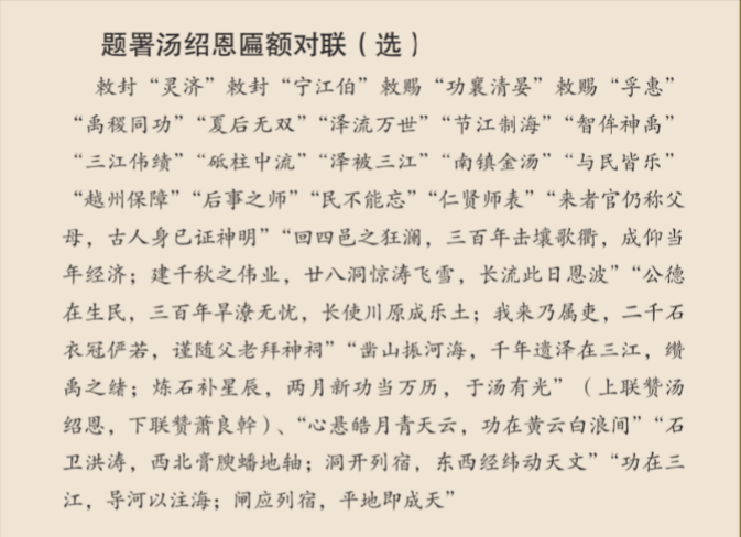 另一方面,汤绍恩的治水行为和功绩被朝廷命官和史学家广为盛赞,甚至把他与大禹相提并论:“公缵禹功”(陶谐语)、“功全禹迹引”(王文镃文)、“禹稷同功”(匾)、“缵禹之绪”(徐渭题)、“洞开缵禹绪”(石之贞题)、“智侔神禹”(李国相立)、“功垂禹绩侔”(朱丙焱诗)、“禹绪谁堪缵,崧生信有由”(朱云俊诗)、“一方之神禹”(见《海滨耆士请封》)。在《入史褒封说》中,还有康熙皇帝“銮舆亲谒神禹,崇德报功,可谓盛矣。汤神之功德如是”的叙述。《三江闸务全书》纂辑者程鸣九,甚至给出“公之恩泽,洵不在禹下”的评价。由此可见,一路走来,历史舞台上的诸位“评委”对汤绍恩亮出的“最高分”。