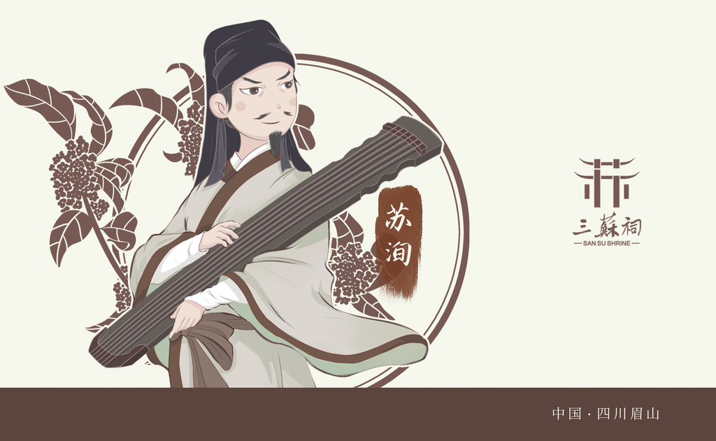 苏洵设计的是剑眉,衣服颜色深棕色,象征大地、自然、简朴、可靠、健康,表现了苏洵为人稳重的特征。根据文献记载,在他的配饰选用上采用了古琴和老树桩。