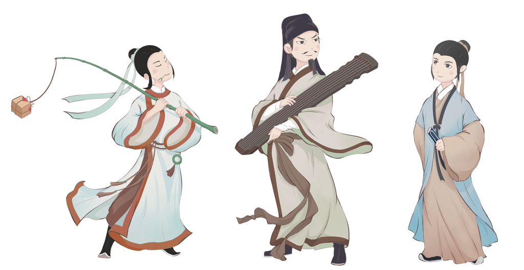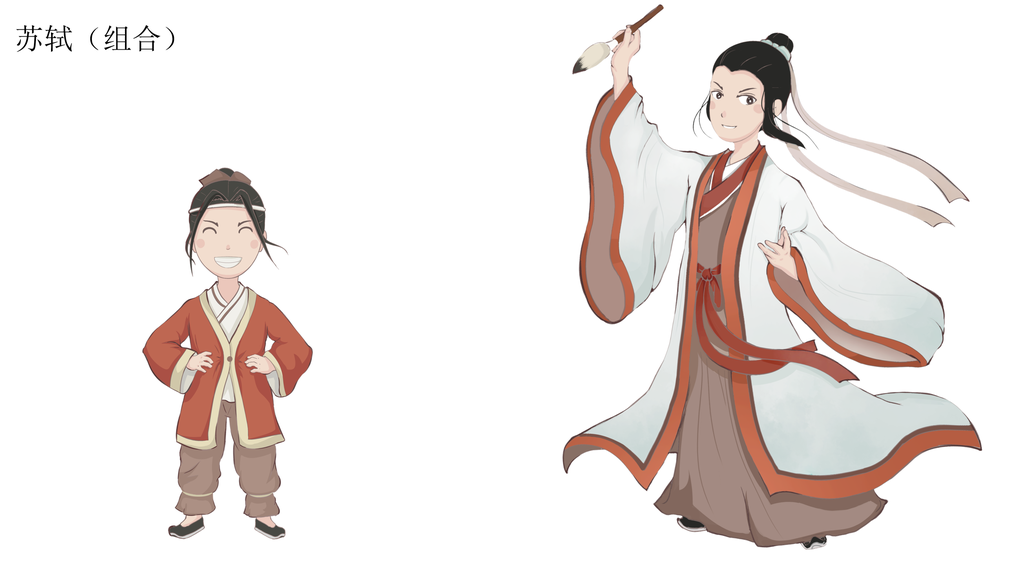 苏轼是一字眉,全梳发髻,两鬓有编发,耳侧有碎发,衣服颜色橘色,象征光明、创造、趣味、青年、活泼向上、直接、冲动、精力充沛,借此来展现苏轼的意气风发,少年得志。而苏轼是大手笔写得好文章,配饰用了毛笔。同时,对于喜欢竹子又是吃货这一特征,也设计了嘴里衔着竹叶,用竹竿挑起糕点的形象。